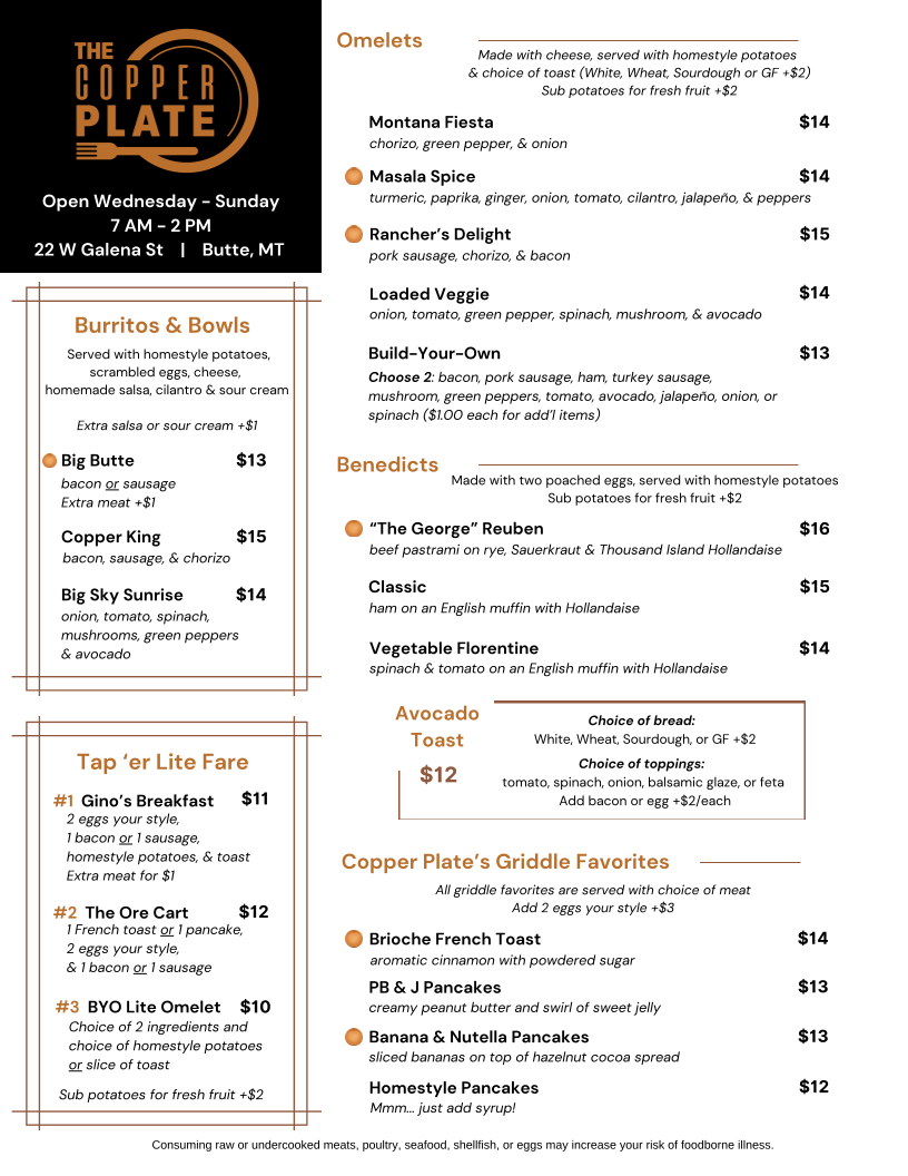 Introducing The Copper Plate, a delightful dining destination nestled in Butte, Montana. This charming eatery has quickly become a favorite for both locals and visitors, standing out with its expertly crafted breakfast offerings. Guests rave about the menu's simplicity and execution, with many recommending standout dishes like the hearty bacon, delicious eggs Benedict, and generous pancakes.